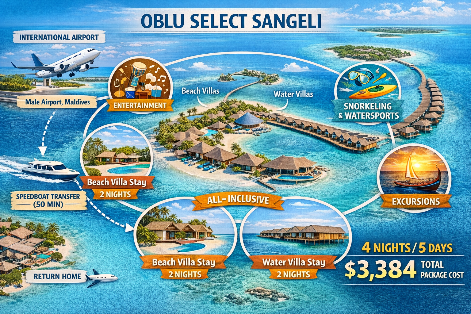 Discover a luxurious island retreat at OBLU SELECT Sangeli, featuring elegant Beach and Water Villas, all-inclusive dining, and convenient speedboat transfers from Malé. Enjoy vibrant entertainment, snorkeling and water sports, wellness activities, and complimentary excursions for an unforgettable 4-night Maldives getaway.